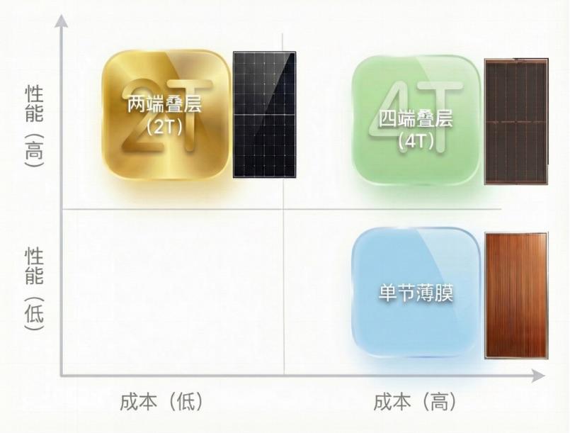 The company emphasizes that perovskite is not equivalent to perovskite thin-film modules. In photovoltaic power generation, different integration approaches of perovskite and crystalline silicon directly determine product form, cost, and scalability feasibility. From an industrialization perspective, the three technical routes can be briefly summarized as follows: single-junction thin-film modules feature relatively low efficiency and high cost; 4-terminal tandem modules offer relatively high efficiency but also high cost; 2-terminal tandem modules deliver relatively high efficiency at a lower cost. These three types of products are fundamentally different in commercial logic and product nature and cannot be simply generalized under the single term “perovskite”.